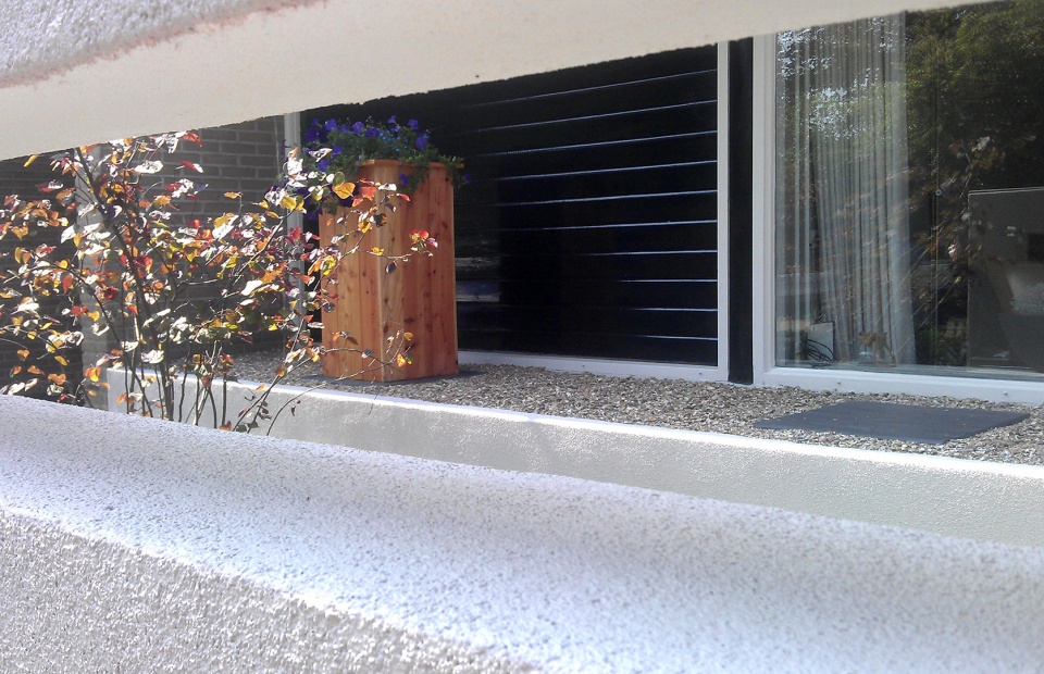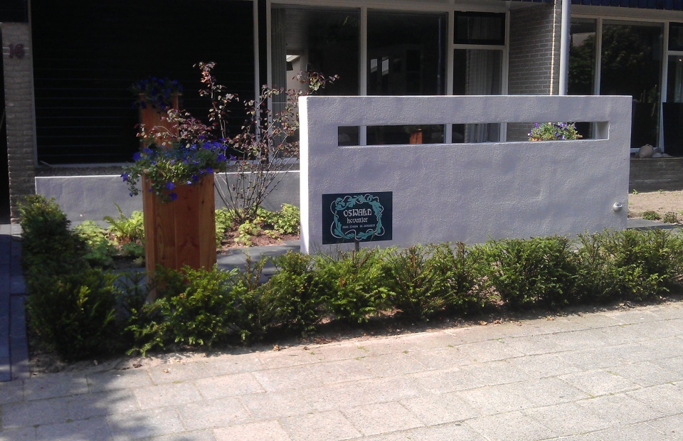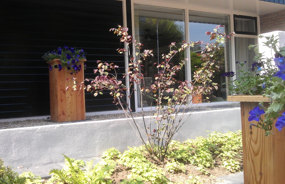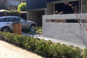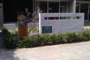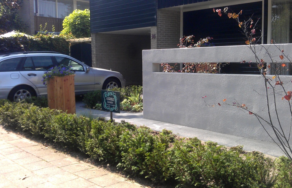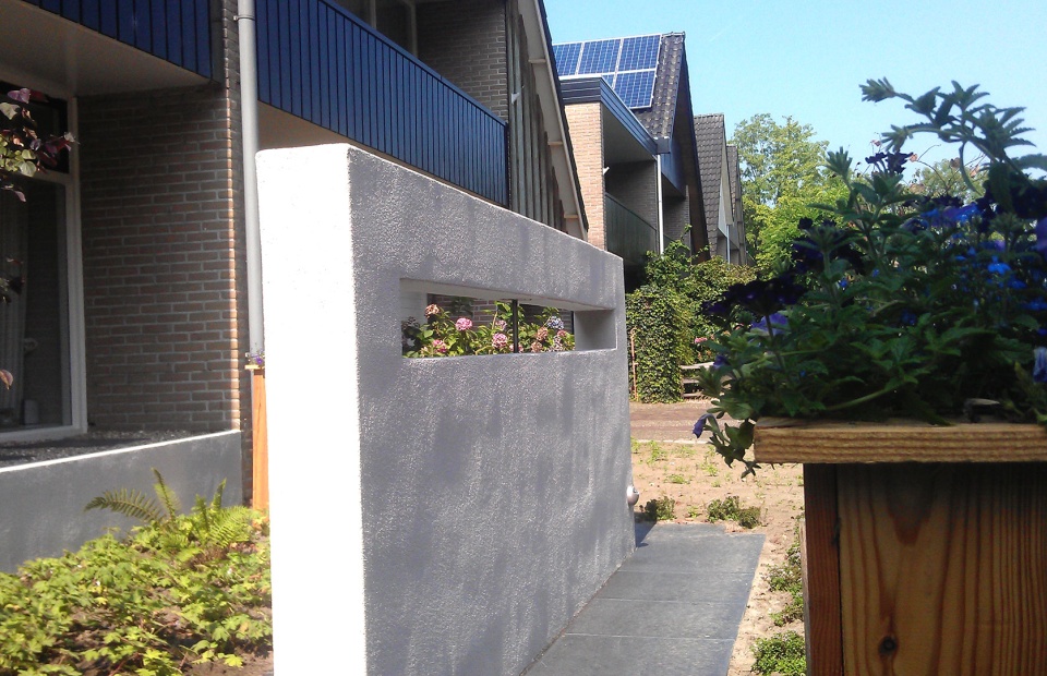 In de voortuin van deze woning is een muur met doorkijk geplaatst. Door de hoogte van de muur is de privacy van de bewoners gegarandeerd, terwijl zij zelf dankzij de smalle opening wel gewoon naar buiten kunnen kijken. Links en rechts van de muur zijn twee beeldbepalende heesters geplaatst, met diep donkerrood blad, die verdere inkijk voorkomen en de tuin extra cachet geven.<<< Terug naar alle referenties